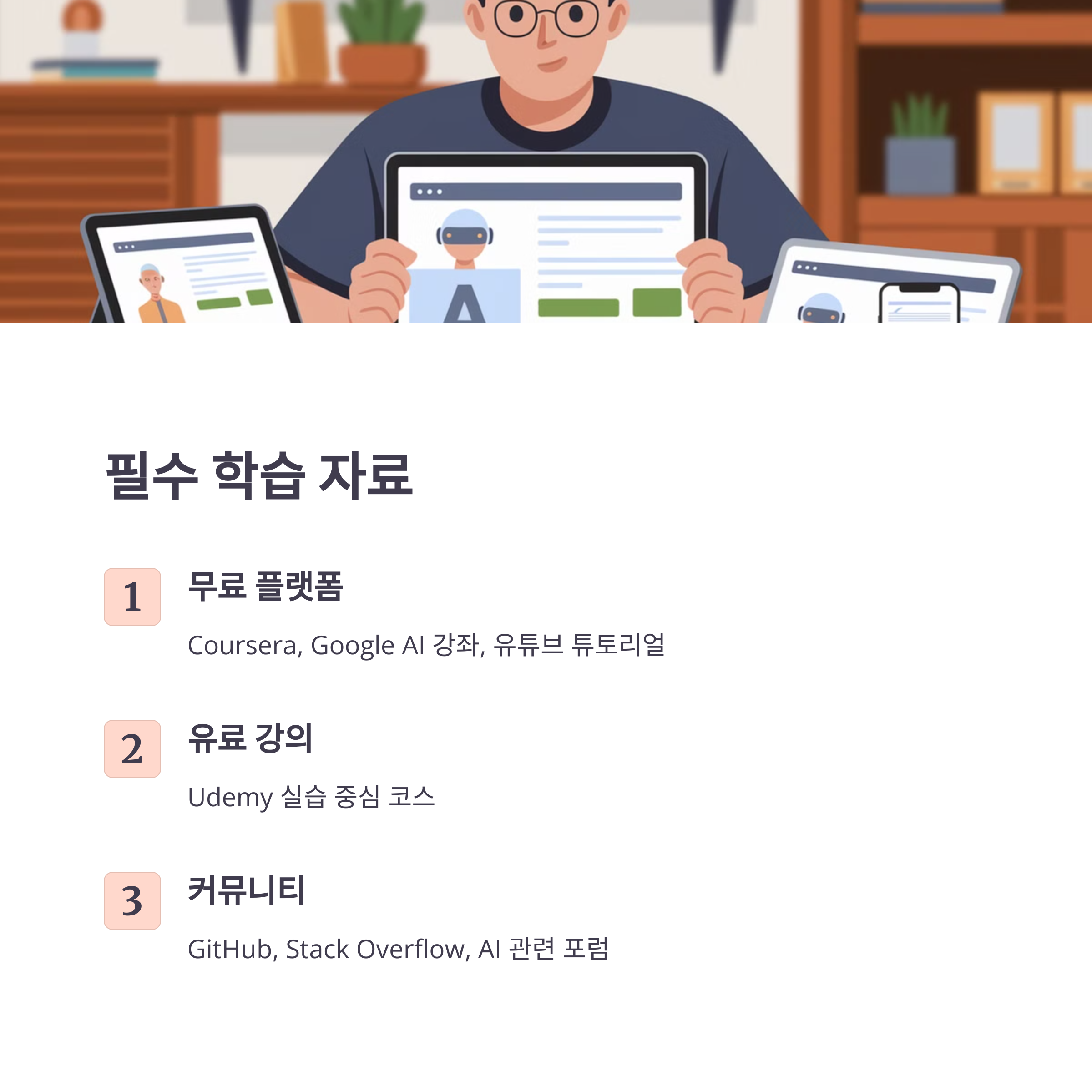 AI ๊ต์ก ์ ๋ฌธ๊ฐ ๋์ค์ ๋๋ค. ์ค๋์ AI๋ฅผ ์ฒ์ ์์ํ์๋ ๋ถ๋ค์ ์ํ ์ถ์ฒ ๊ฐ์ข๋ฅผ ์๊ฐํด๋๋ฆด๊ฒ์. ์ ๋ ์ฒ์์๋ ์ด๋์๋ถํฐ ์์ํด์ผ ํ ์ง ๋ง๋งํ๋ต๋๋ค. ๊ทธ๋์ ์ ๊ฐ ์ง์ ๊ฒฝํํ๊ณ ๊ฒ์ฆํ